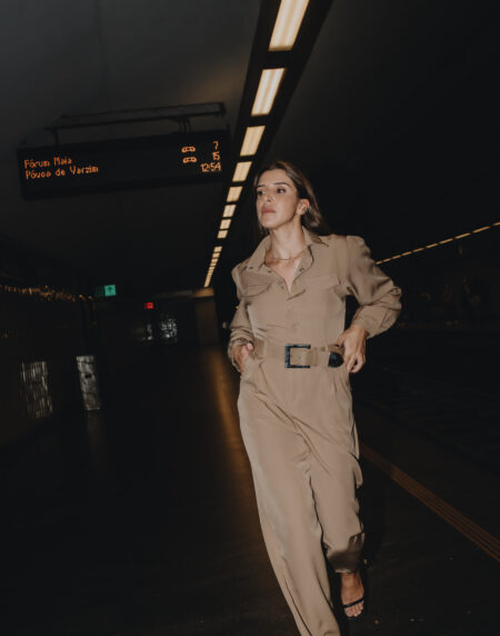 Modelo com botões em tecido, manga abalonada e decote em V.