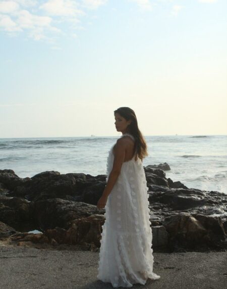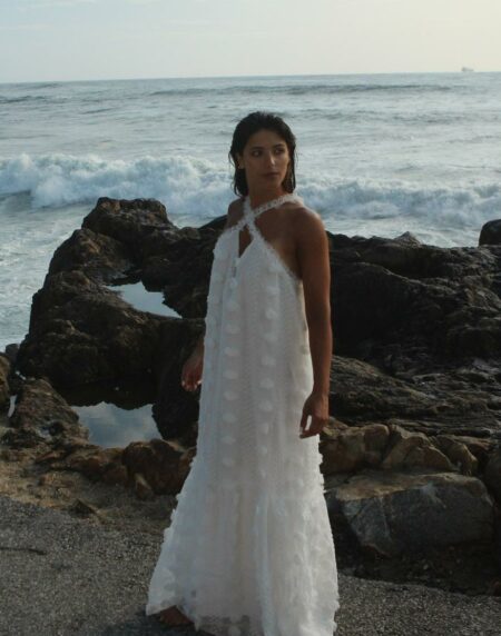 Vestido longo branco com plumeti com pormenor de renda nas