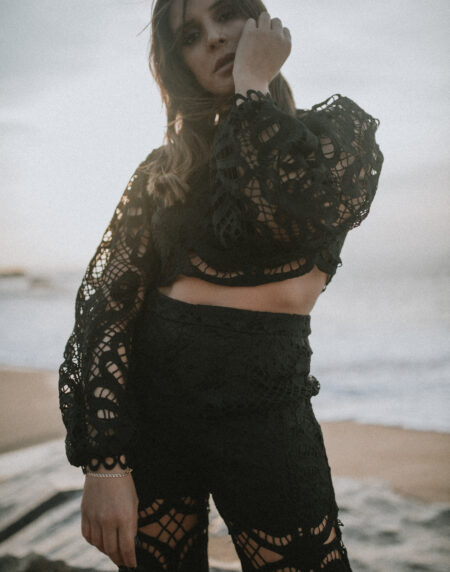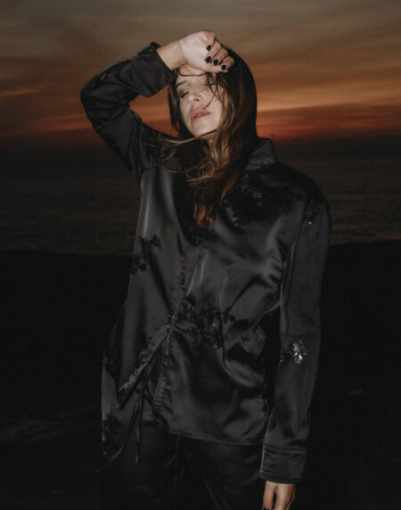 Look total em tecido acetinado com brilho, estilo pijamero.